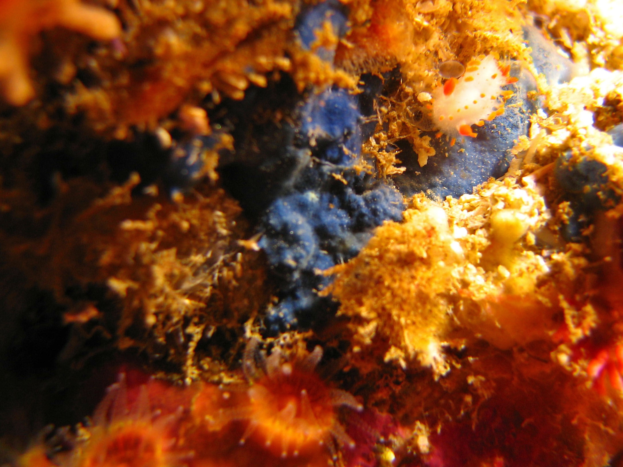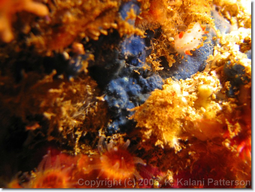 IMG_1625-crop * Cockerell's Dorid (Limacia cockerelli), Orange Cup Corals, Cobalt Sponge, Red Sea Star * 2638 x 1979 * (917KB)